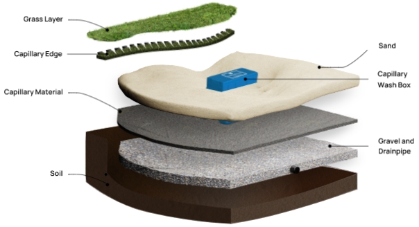 Capillary Bunkers is the full-scale bunker system ensuring enduring quality for players and ease of maintenance for the crew by providing optimal drainage and moisture rate in the bunker sand