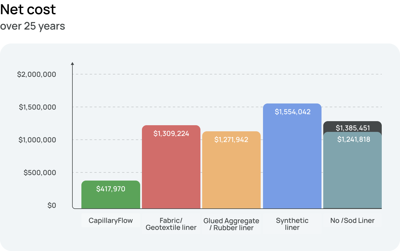 *Based on renovating 80 bunkers of a total 50,000 sq. ft., with sand price of $80 per short ton and labour price of $30 per hour. Liner prices are based on USGA data. Contact your CapillaryFlow representative to learn more.