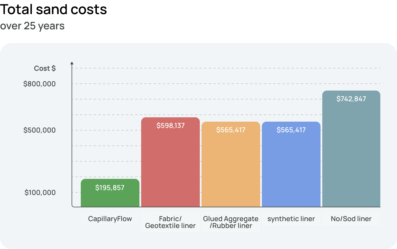 By eliminating frequent sand touch-ups and occasional sand & liner replacements, Capillary Bunkers cost a third as much in the coming 25 years*, compared to other bunker liner options yet still perform the same way they did in year one.