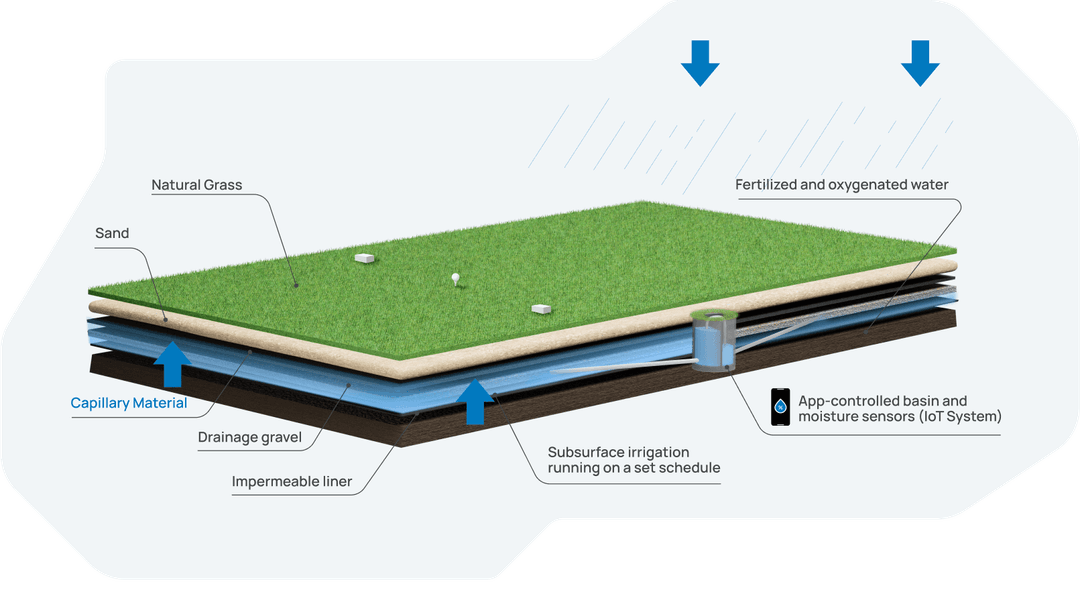 The Capillary Hydroponics system enables us to grow strong and durable grass with significantly less maintenance and environmental impact
