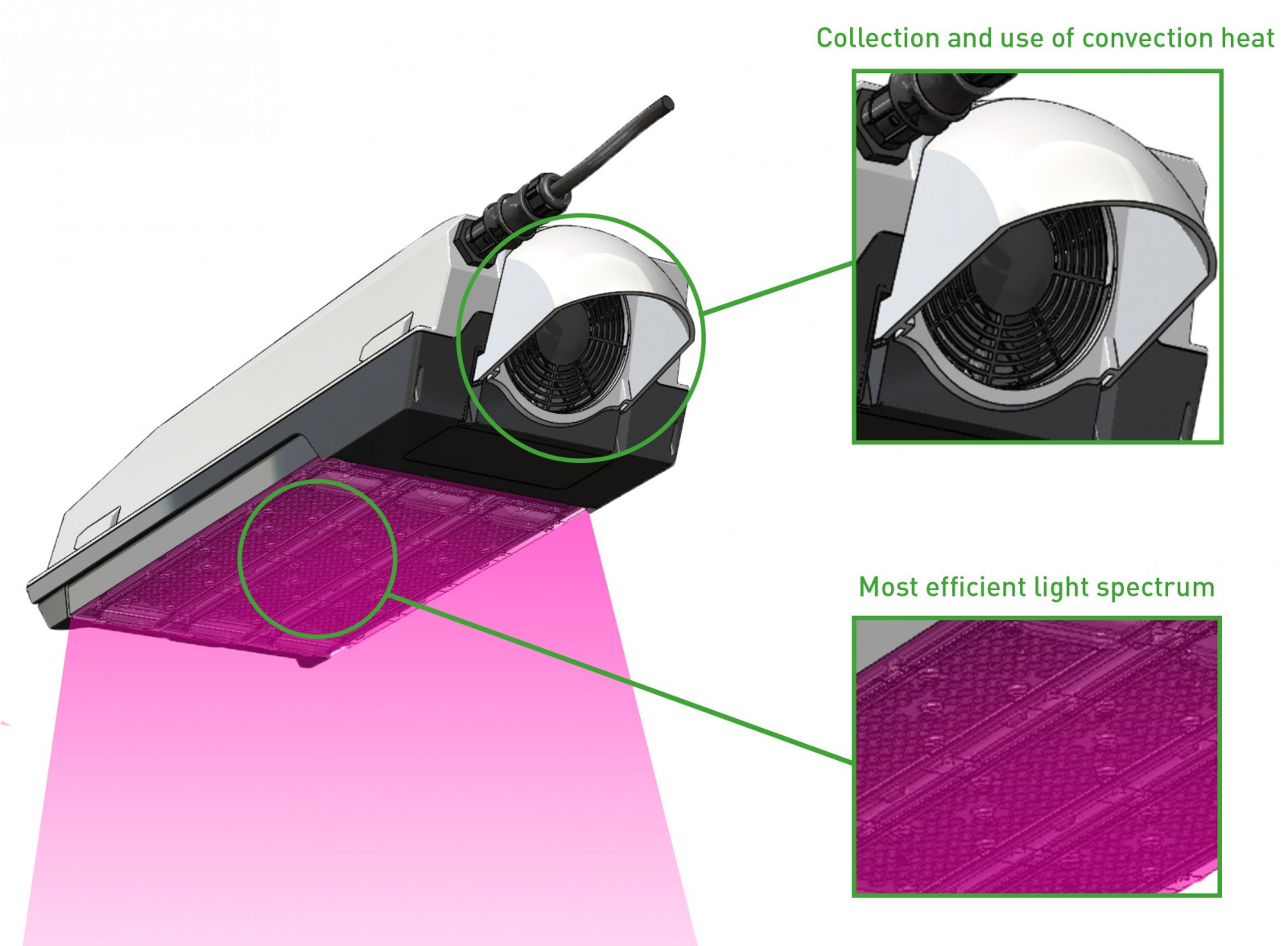 Roughly 35% of the energy an LED fixture uses is converted in convection heat. Convection heat warms the air around the fixture and is not directed to the surface, which means this energy is wasted. Our LED fixture collects this heat and redirects it towards the surface when additional heat is needed. This innovative feature ensures that no precious energy is lost, making the fixture highly efficient and sustainable.