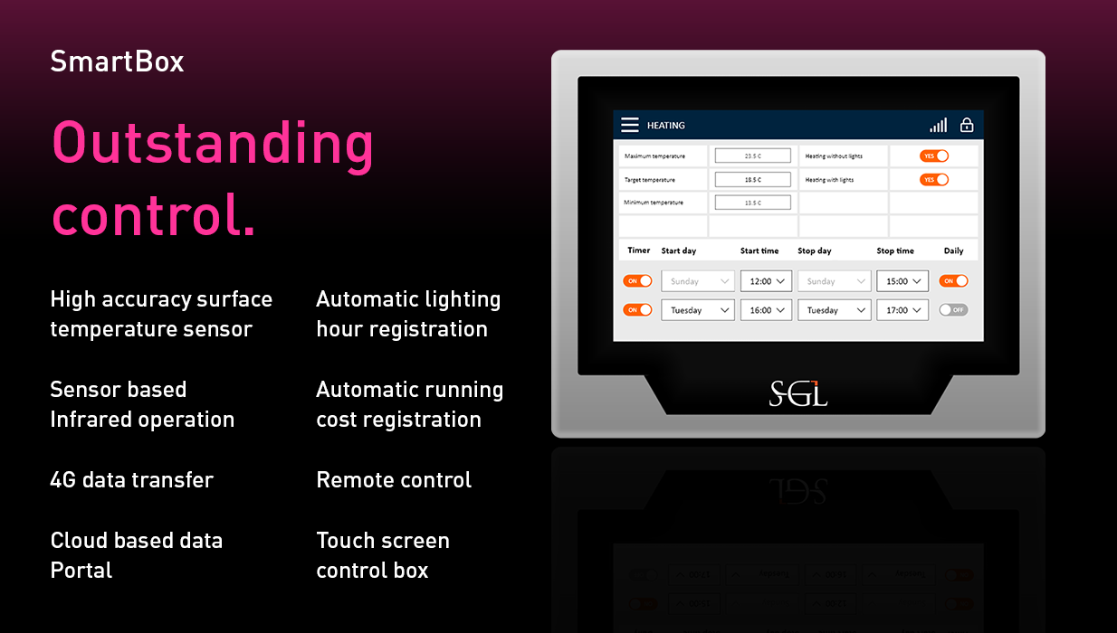 The LED120 is equipped with a built in sensor that measures the temperature on the pitch, and is connected to the SmartBox. Only when the sensor detects a shortage of available heat, the system will automatically activate the infrared to create the optimal grass growth conditions. This data driven approach ensures that the LED120 is used in the most effective and energy efficient way possible, resulting in the highest grass quality and maximum energy savings.